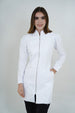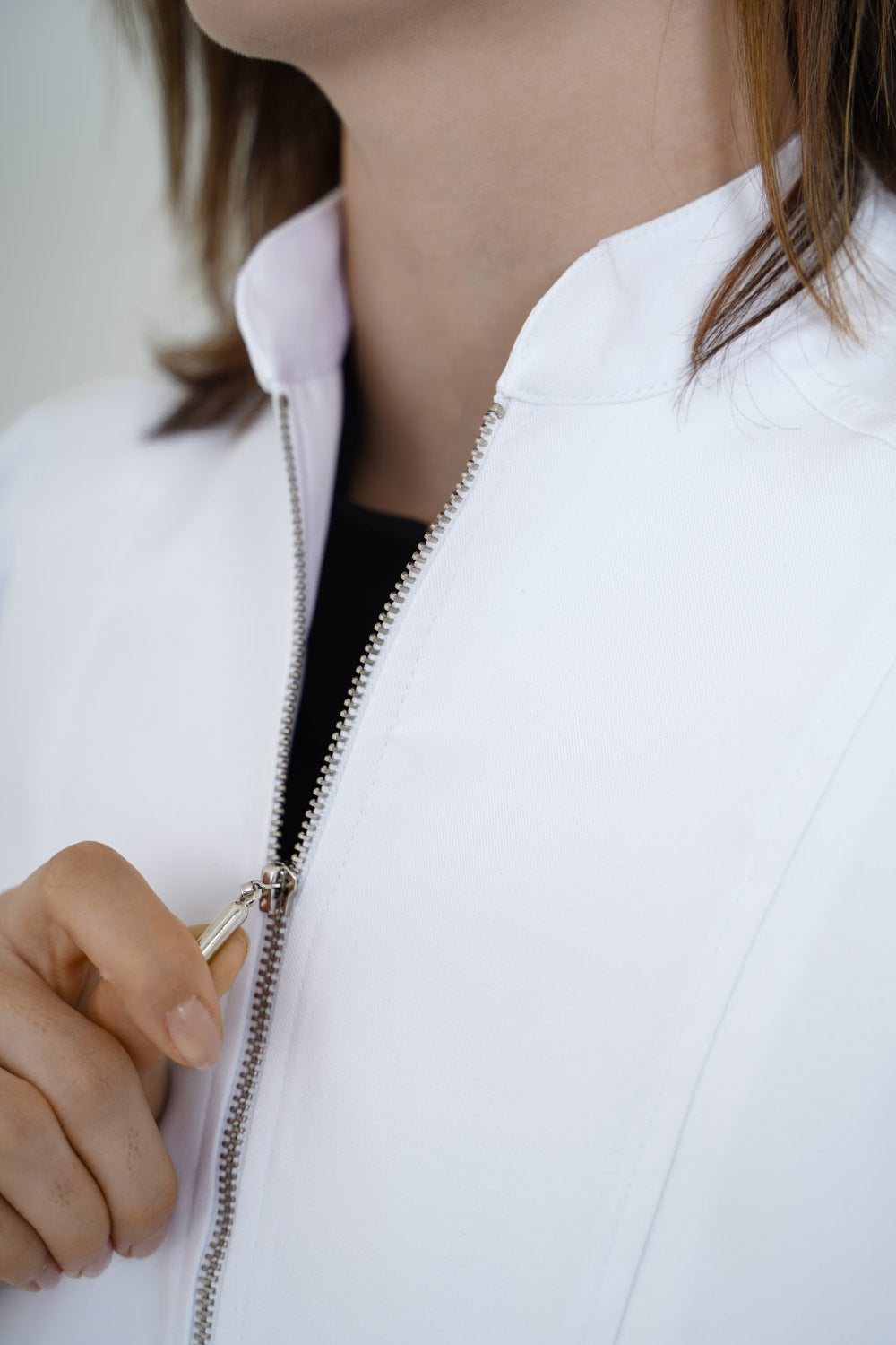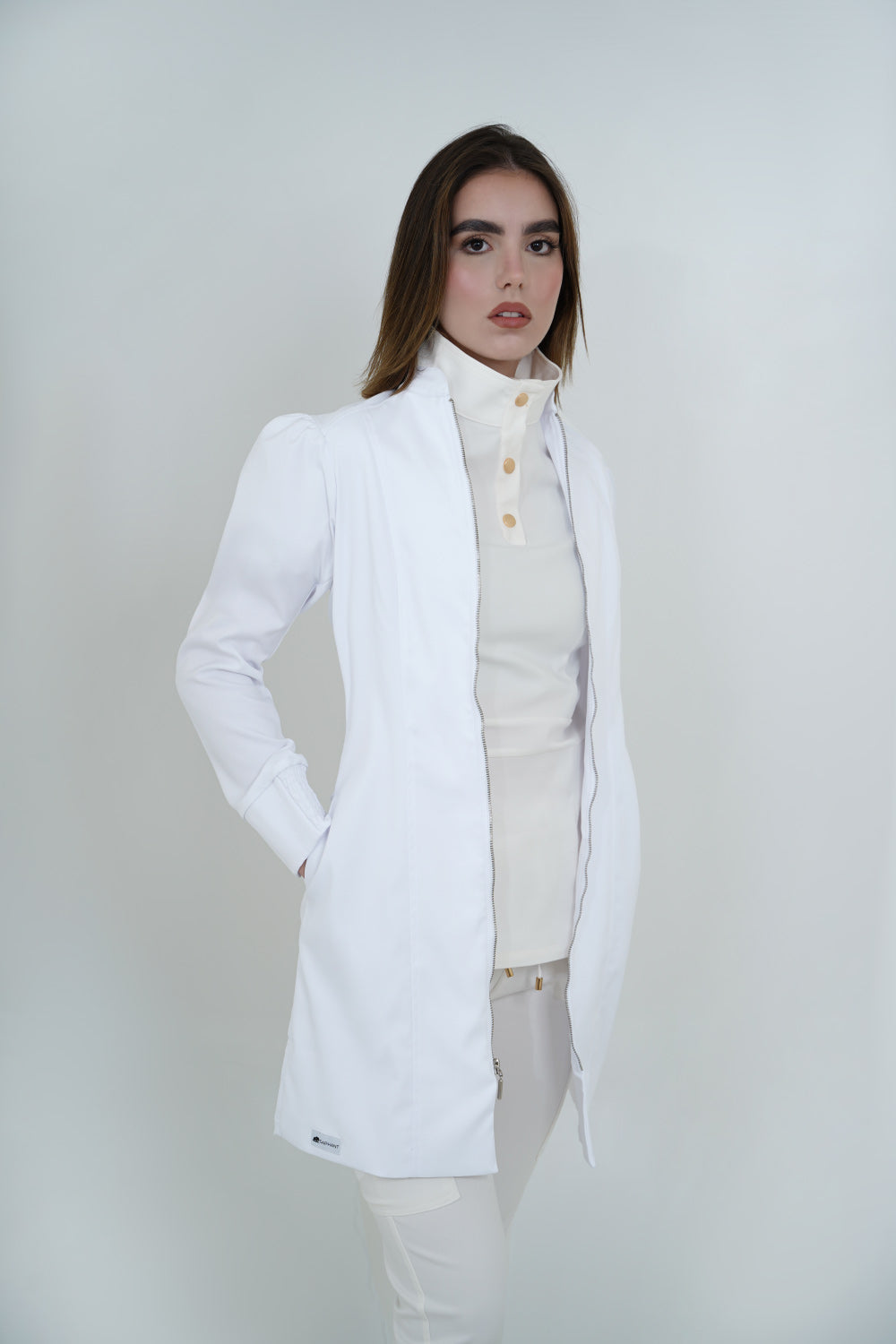 | Bata color blanco con cierre, bolsillos laterales, manga tipo globo, horma ajustada. |
