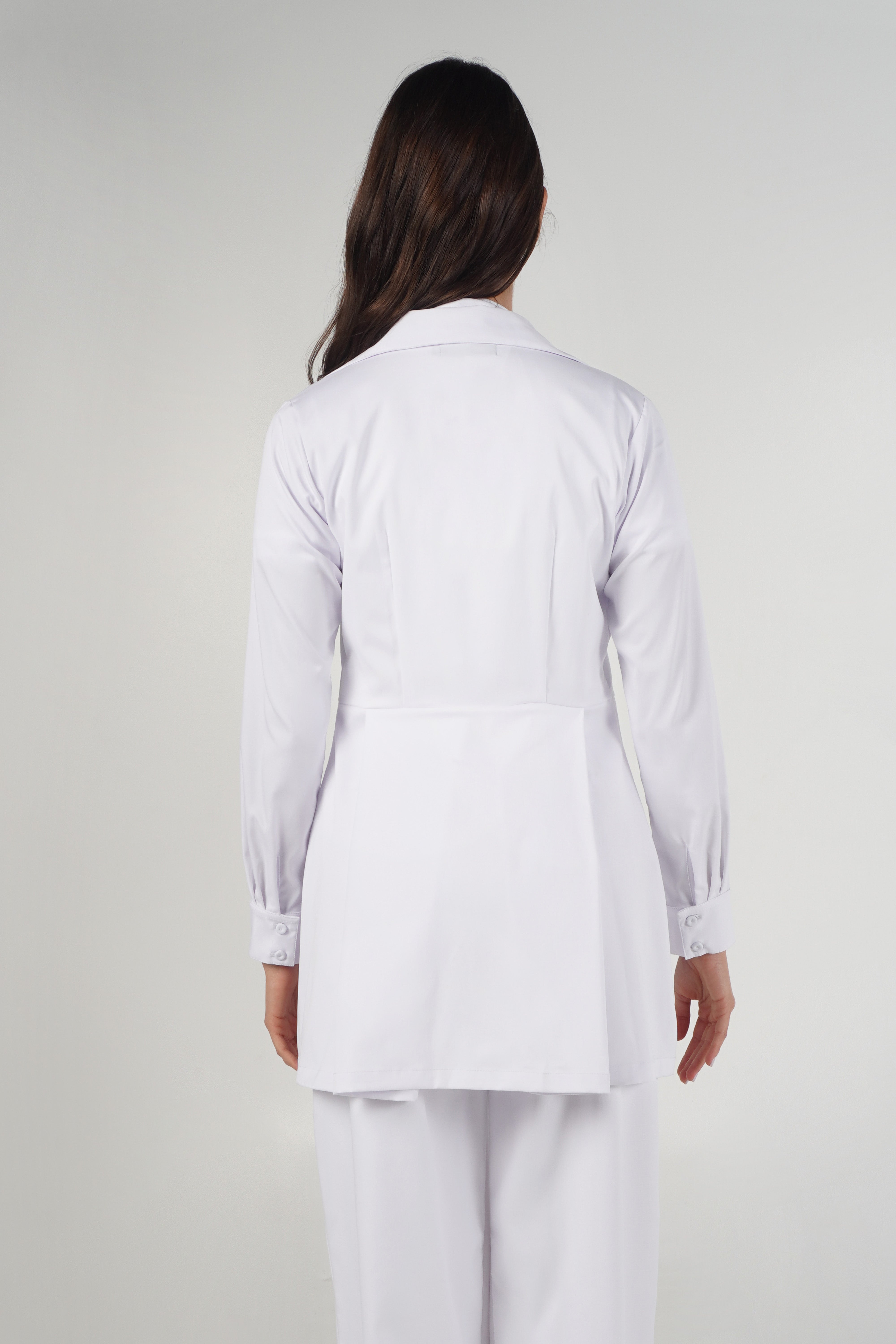 | Bata color blanco con cierre, tipo campana, con 4 bolsillos frontales, horma holgada. |