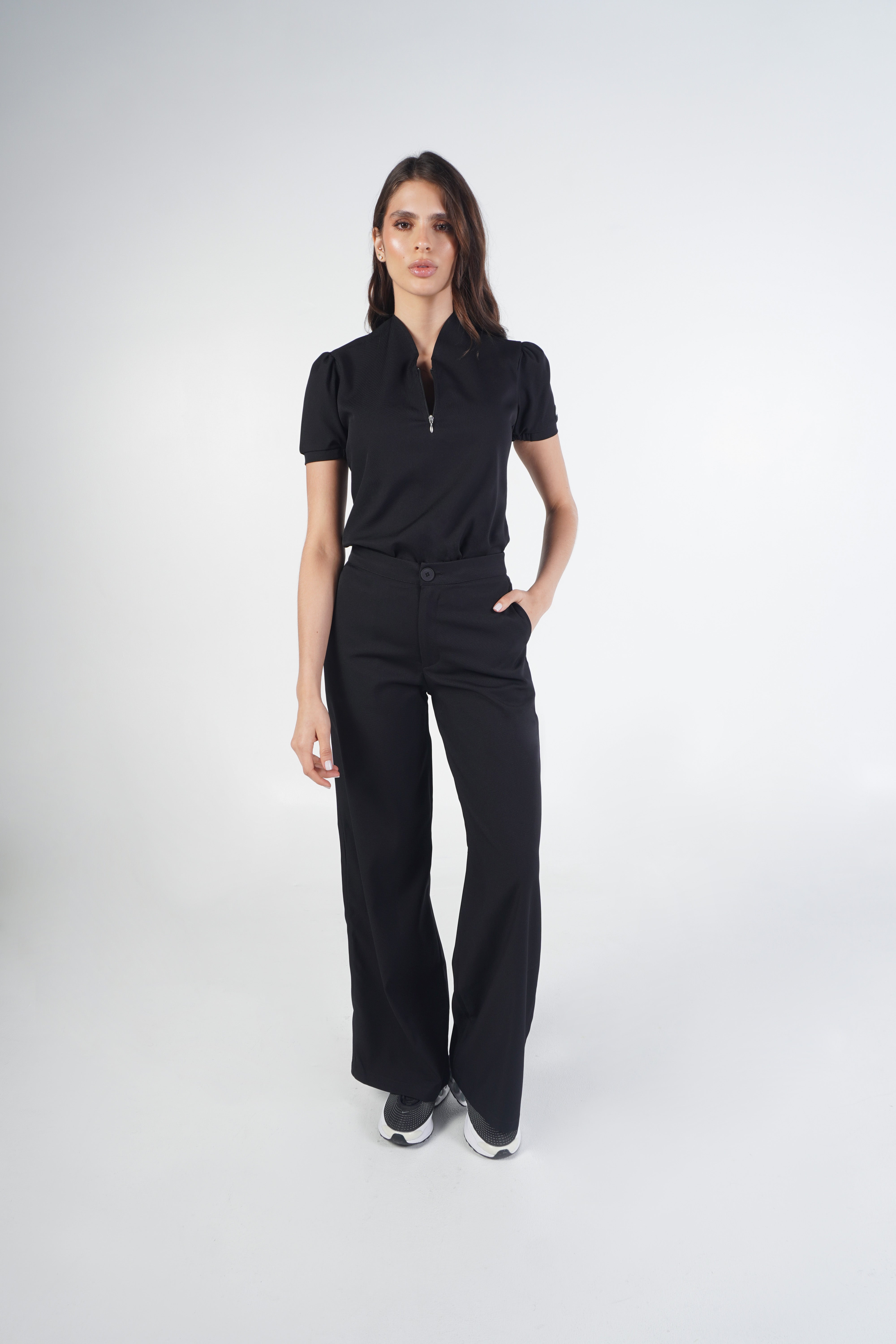 | Camisa cuello curvo con cierre metálico frontal, manga globo, horma holgada. |