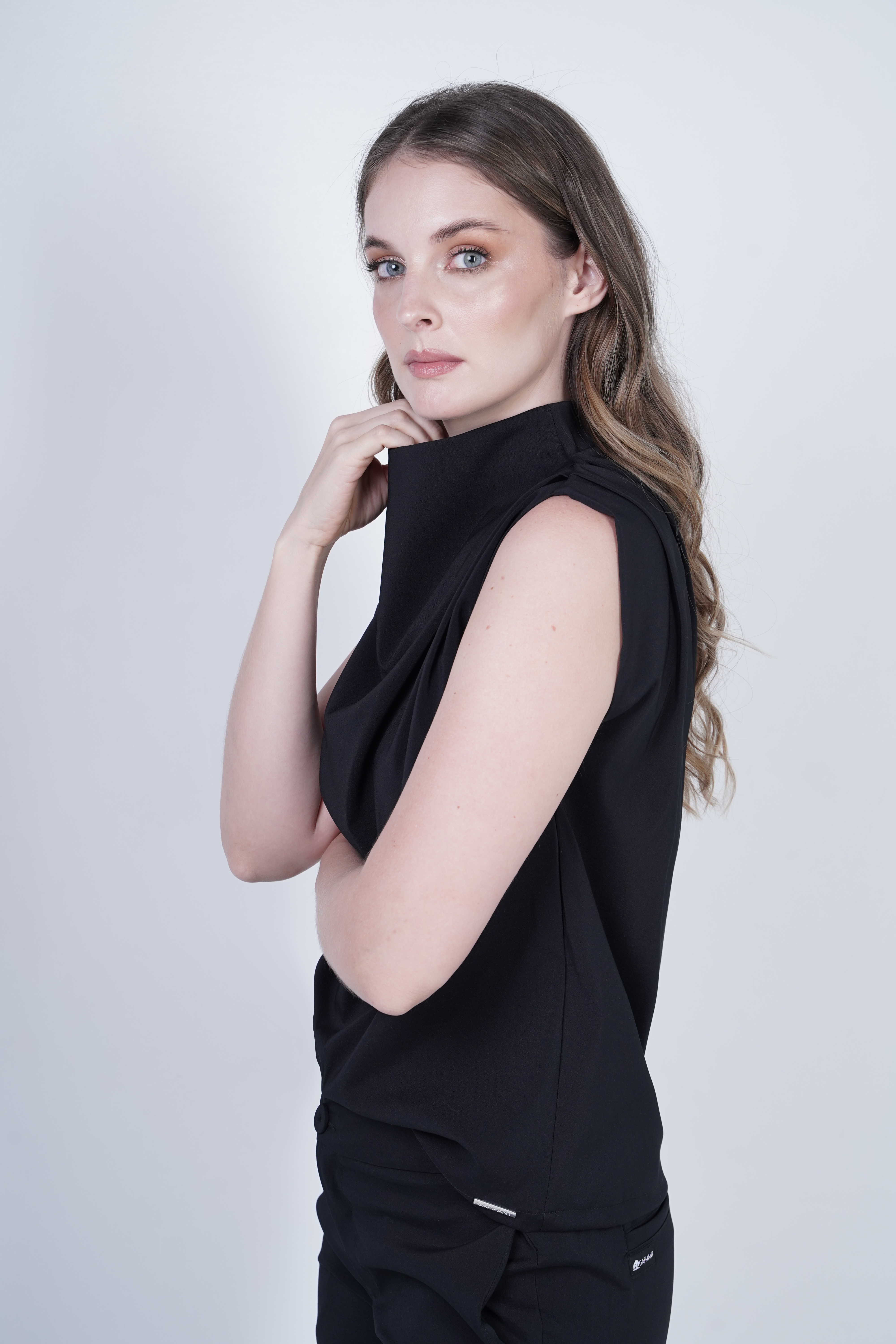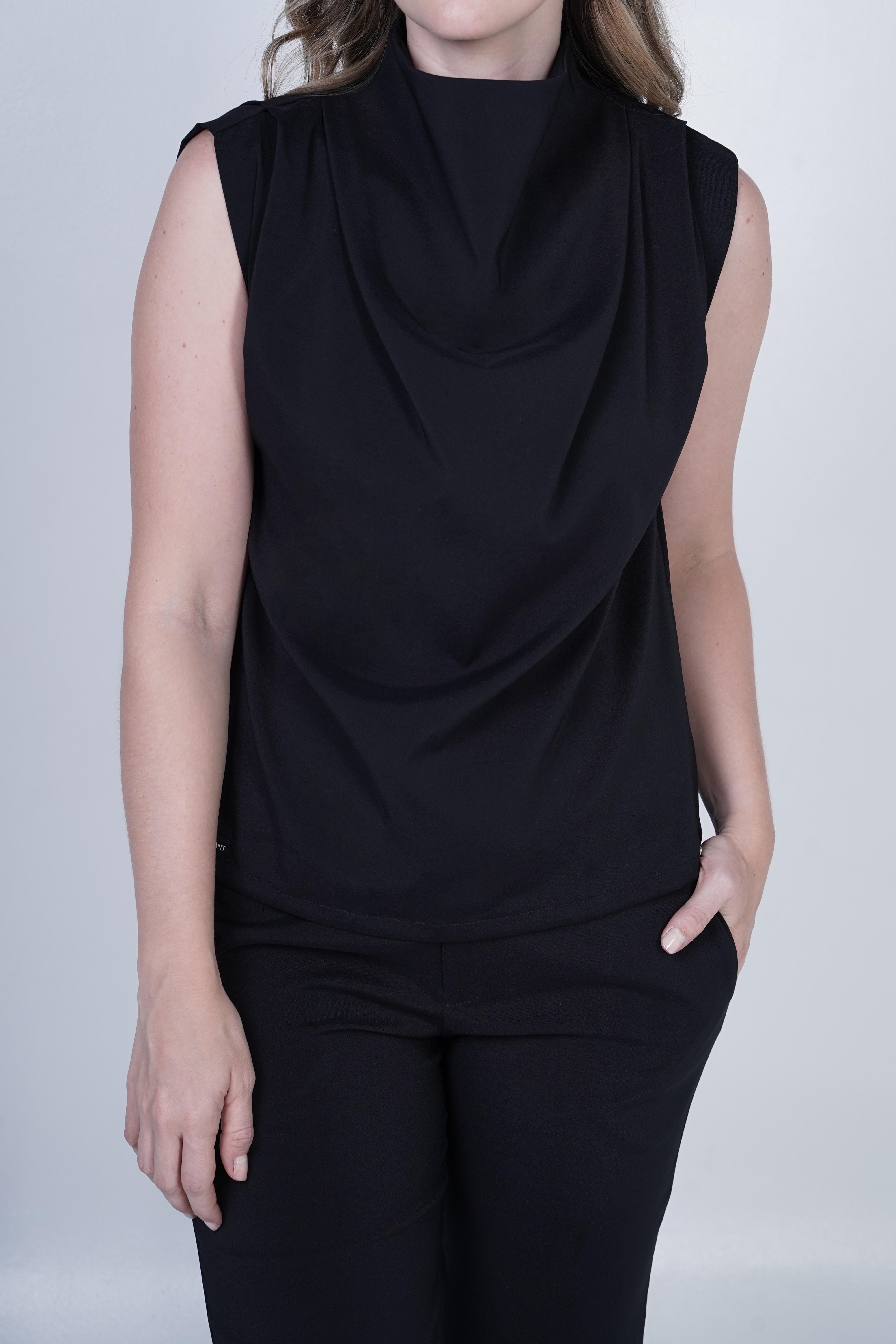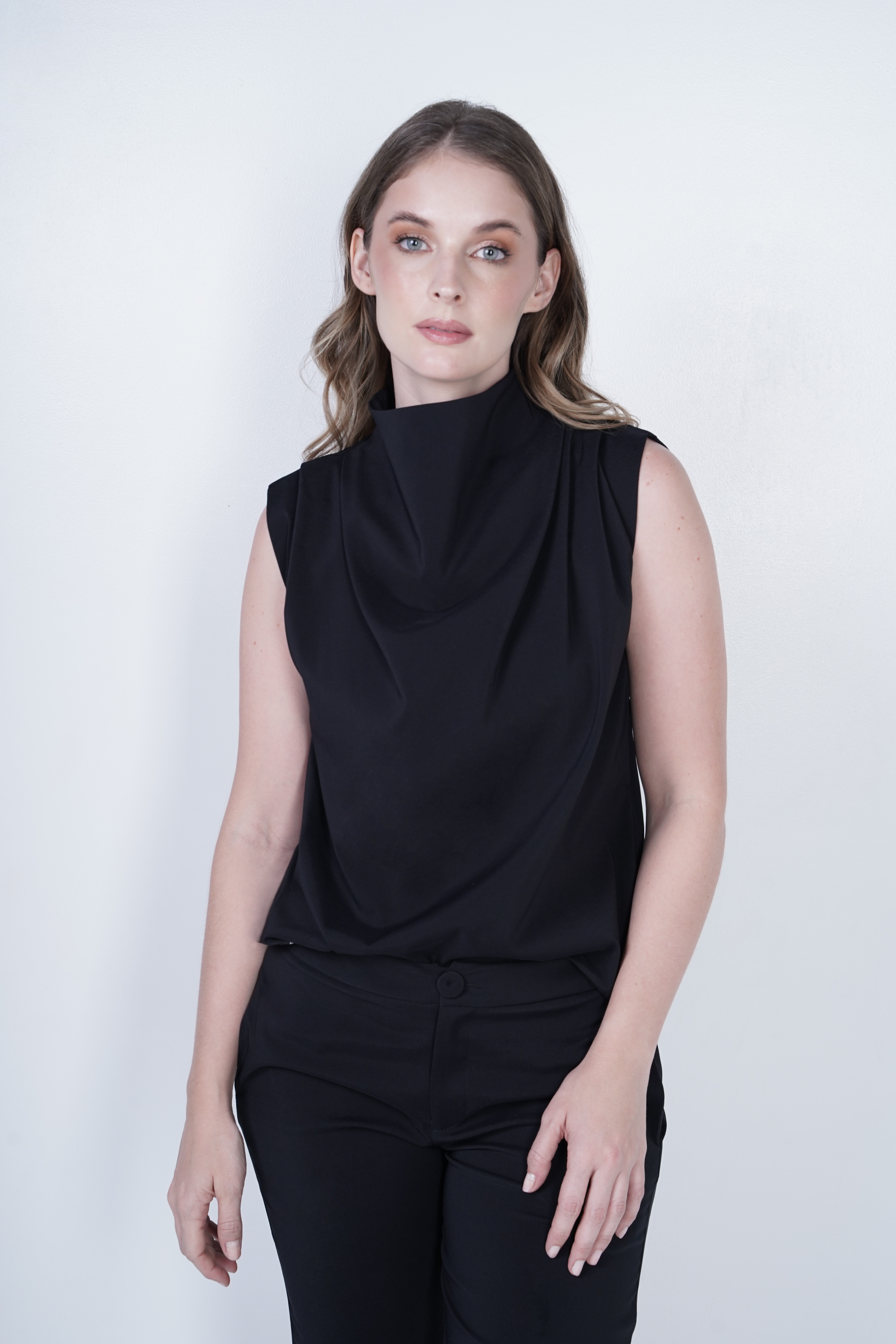 | Camisa sin manga con cuello drapeado, cierre invisible, horma holgada. |