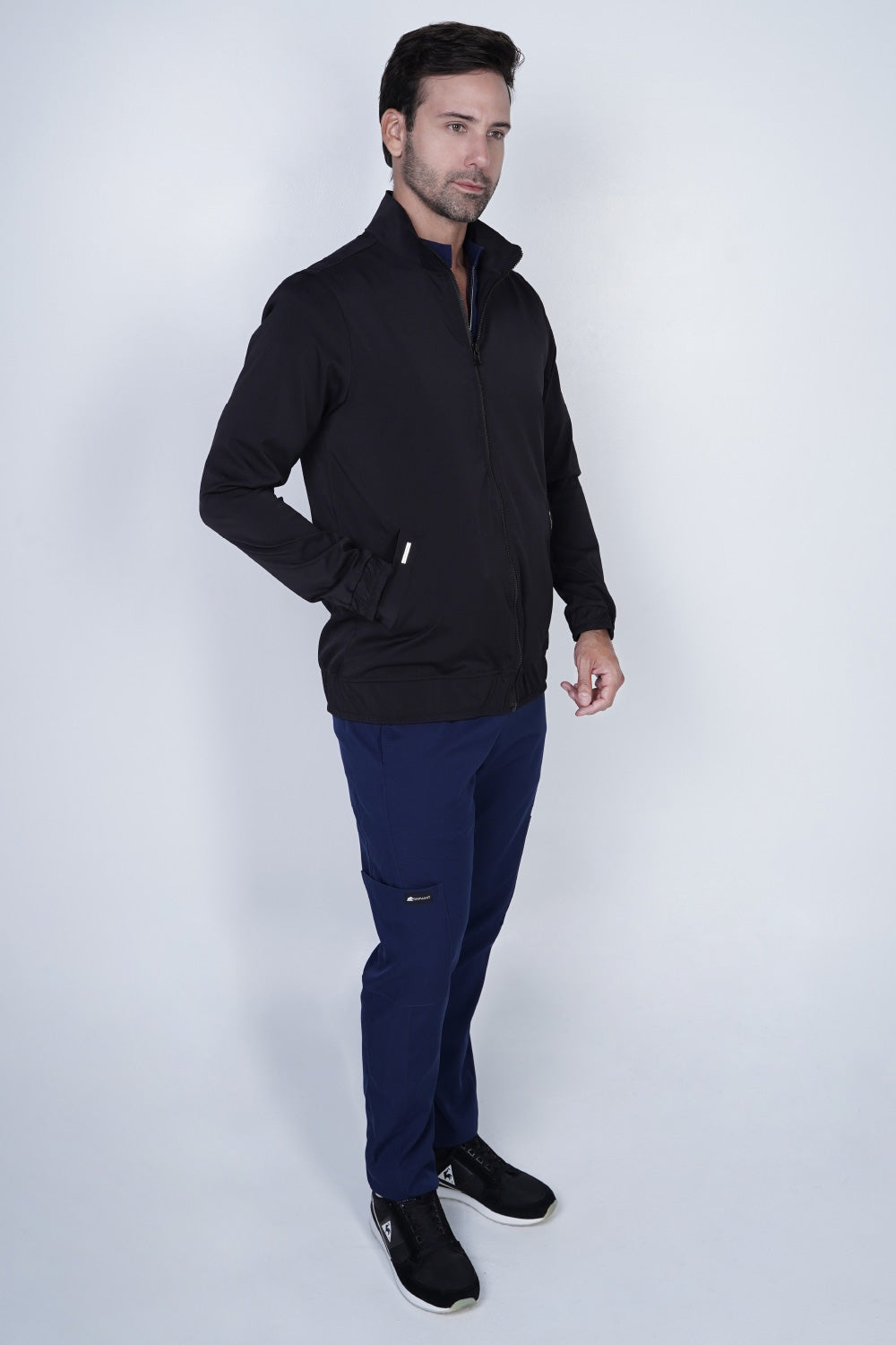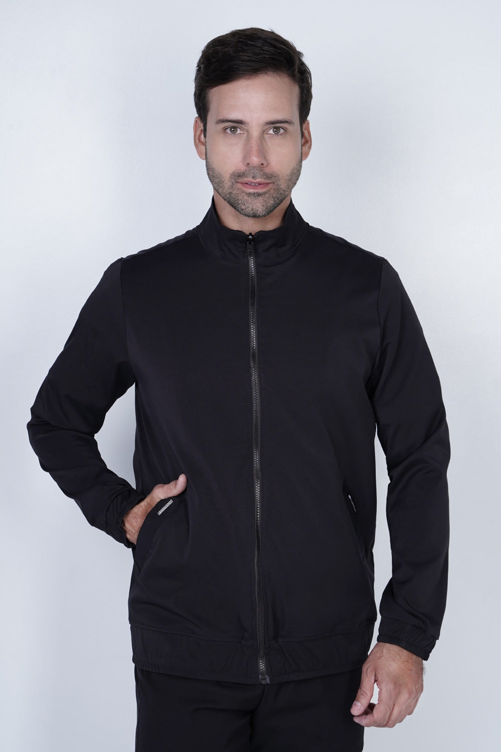 | Chaqueta masculina negro con mangas, cierre delantero, cuello tipo mao. |