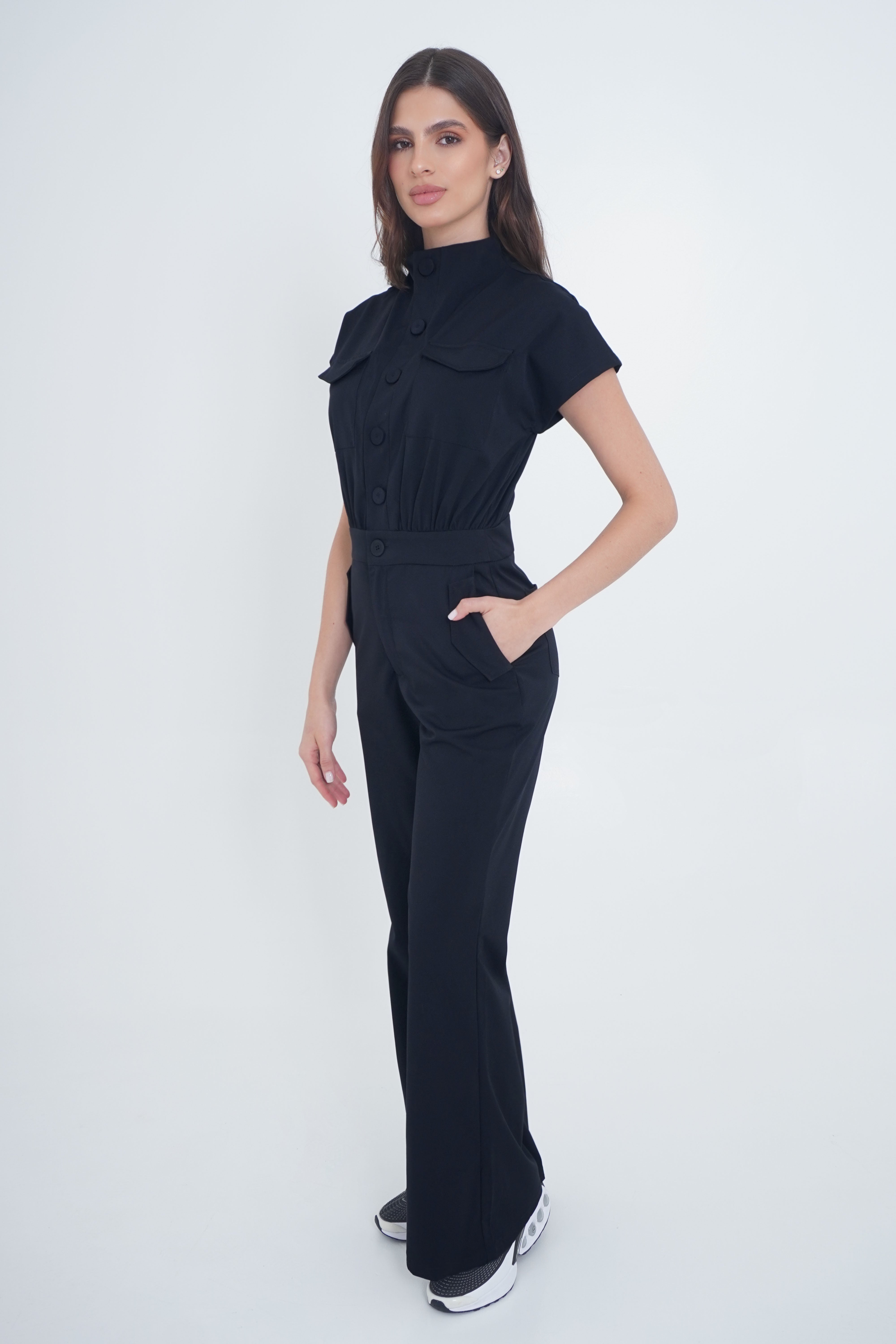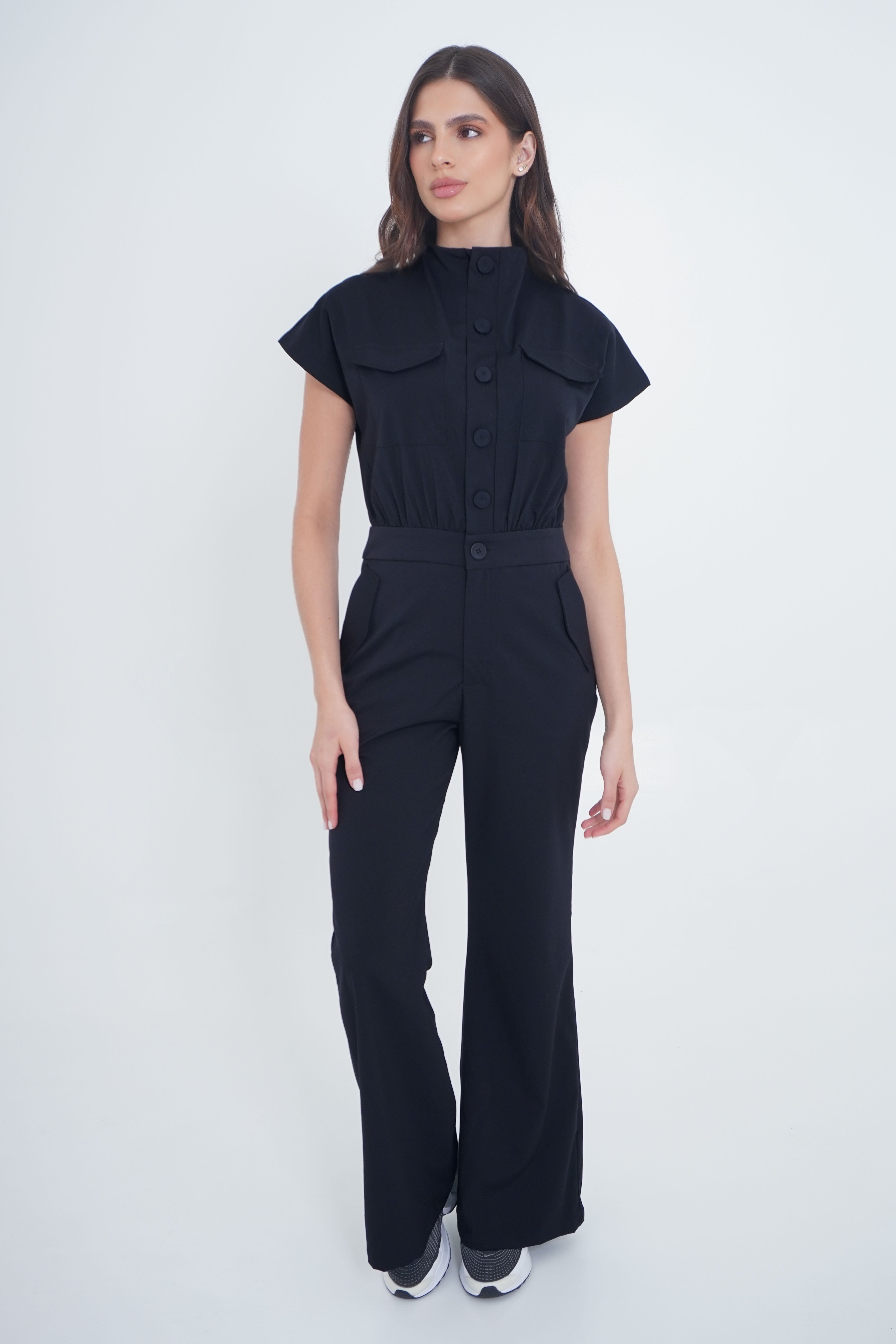 | Enterizo silueta tipo flare con cuello tipo tortuga, bolsillos frontales a la altura del pecho y cierre de botones, bota campana. |