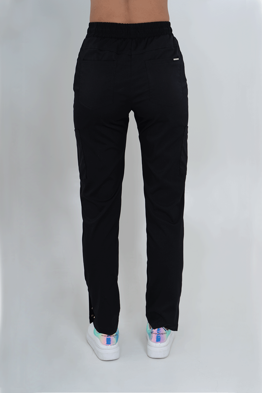 | Pantalón bota recta con pretina resortada, bolsillos delanteros, laterales y traseros con botones laterales cerca de la bota. |